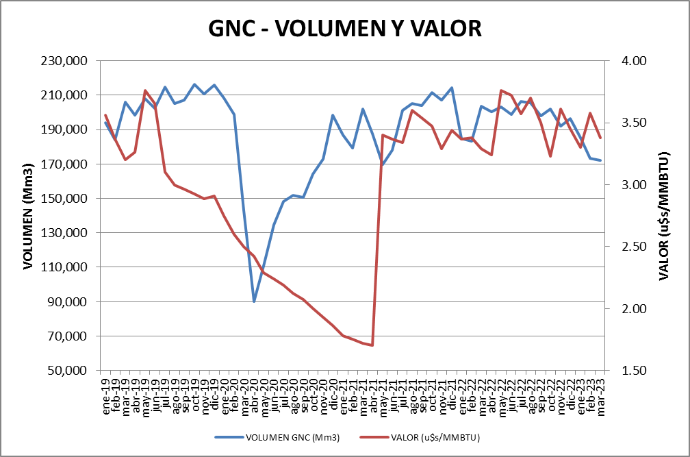 Se vendieron, en marzo de 2023, 5,56 MMm3/día de Gas Natural Comprimido, valor un 0,50% por debajo del mes anterior y un 15,34% menor al de marzo de 2022.