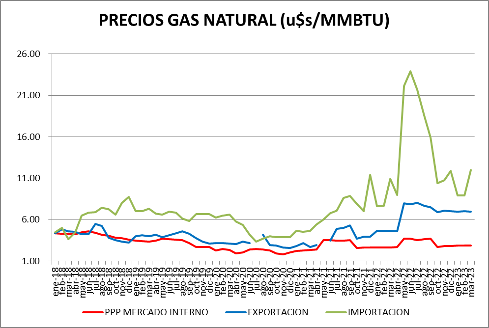 En marzo de 2023 se producen modificaciones menores de los precios promedio a nivel general. El valor de 2,89 dólares por millón de BTU es un 9,89% mayor que el de marzo de 2022.