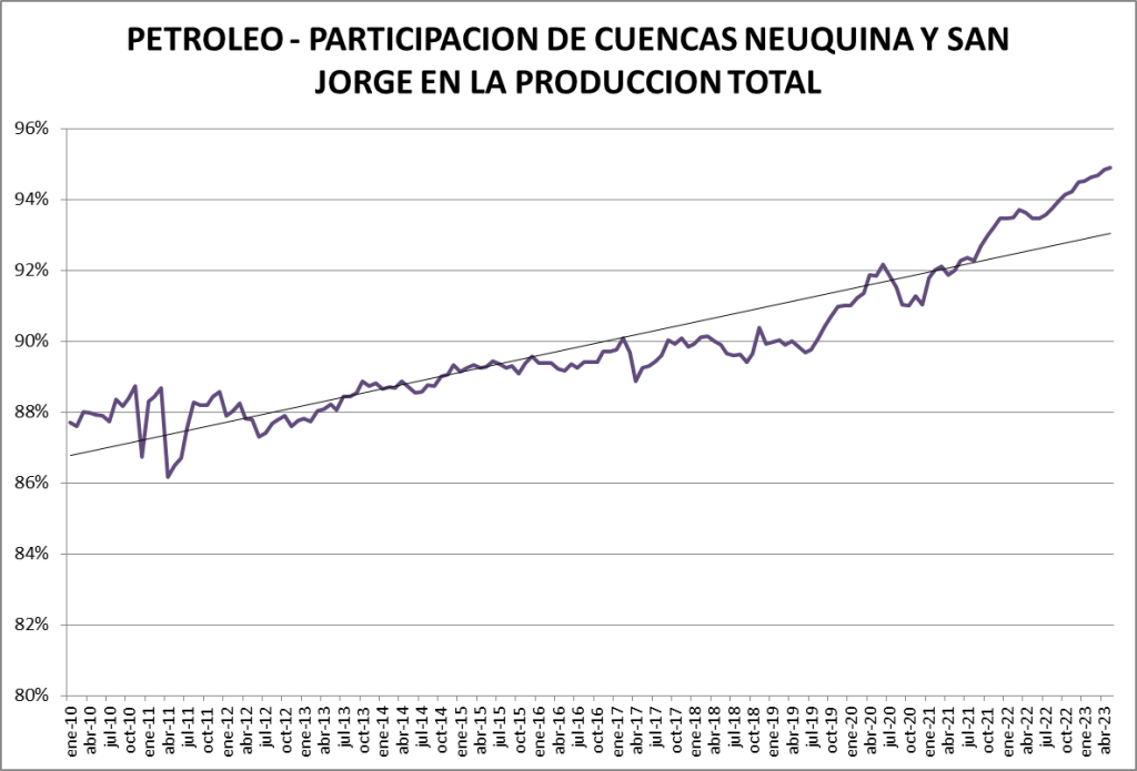 La Cuenca Neuquina es la que más sigue creciendo interanualmente, apoyando su producción en Vaca Muerta (+17,17%, interanual). La segunda cuenca en importancia, la del Golfo San Jorge bajó un 1,01%.