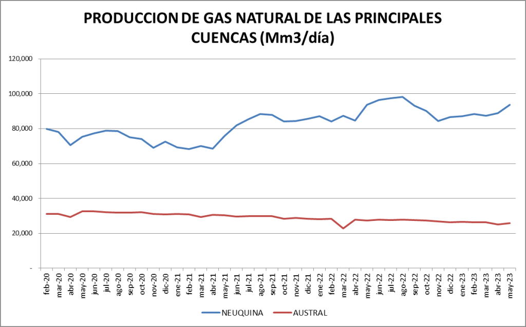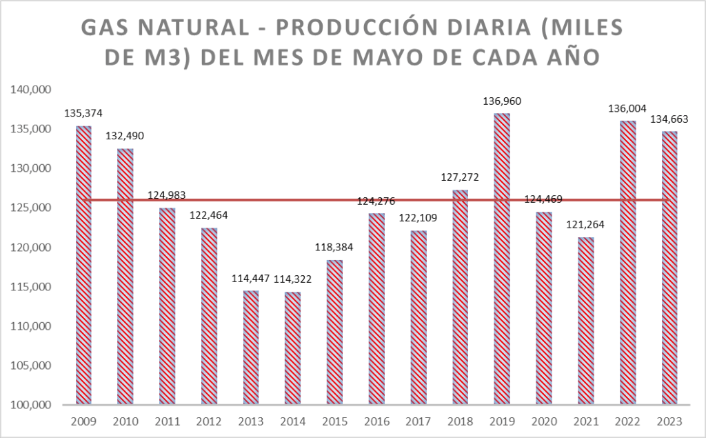 La producción diaria de mayo de 2023 es superior al promedio de la serie (que incluye el valor de 1999 y es 87.445 m3/día).