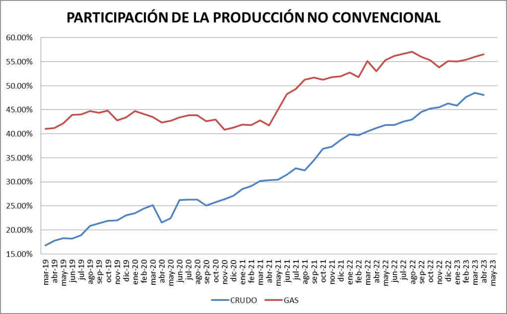 La participación del crudo no convencional en el total de la producción nacional fue, en mayo de 2023, del 48,24%, algo superior a la del mes anterior.