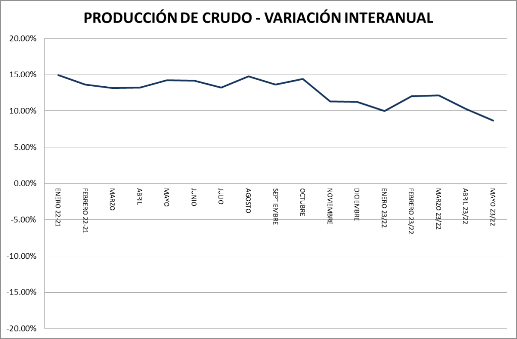 En el mes de mayo de 2023, en petróleo crudo, se muestra una caída en el crecimiento. Y esto sucede por segundo mes consecutivo. Habrá que seguir esta evolución.