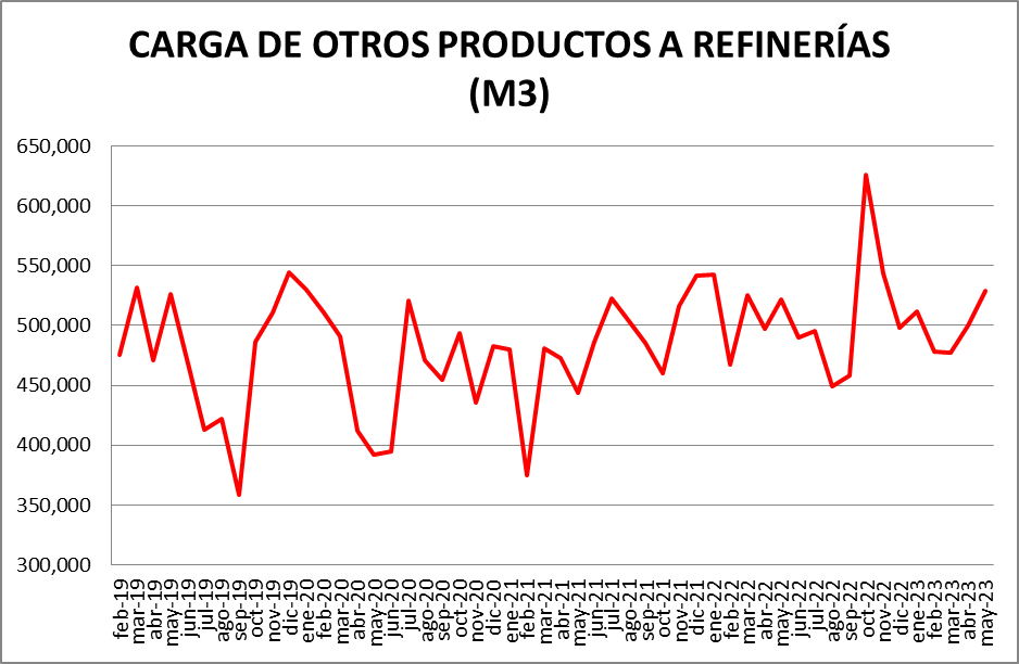 Dentro del rubro “Otras cargas” donde ” se encuentran: naftas sin terminar, mejoradores octánicos, cortes de gasoil, nafta virgen, cortes de kerosene, nafta reformada, destilado de vacío, etc., la evolución fue la siguiente: respecto a abril de 2023: +5,88%; respecto a mayo de 2022: +1,38%.