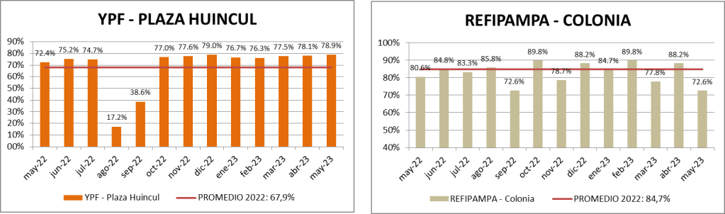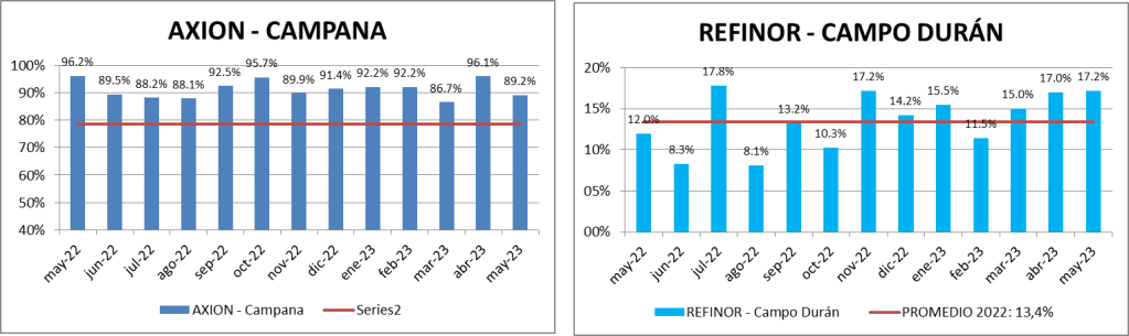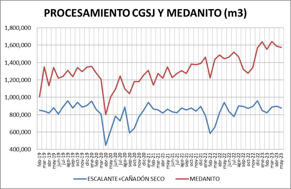 Escalante-Cañadón Seco: Se procesó, en mayo de 2023, un 2,40% menos que en abril de 2023 y un 6,79% también menos que en mayo de 2022. Si se calcula el procesamiento diario, teniendo en cuenta que mayo tiene 31 días y abril 30, el procesamiento fue un 5,5% menor que el mes anterior.