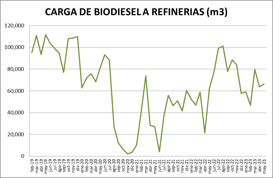 La carga de biodiesel en refinerías subió, en mayo de 2023, un 3,74% respecto al mes anterior.