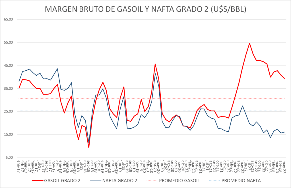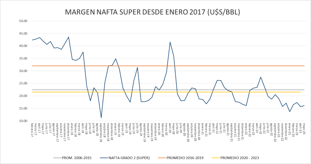 El margen bruto de nafta sigue por debajo del valor del promedio del período enero 2020 – mayo 2023.