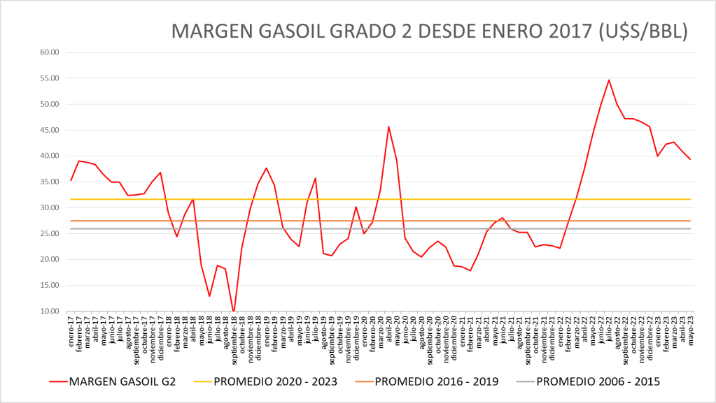 El Margen del gasoil grado 2 de mayo de 2023 (39,38 u$s/bbl) se sitúa por encima del promedio del período enero de 2016 a mayo de 2023 (30,54 u$s/bbl).