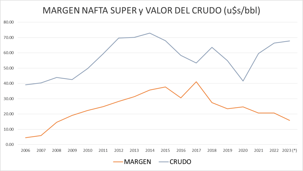 | Año | Valor (u$s/litro) | Margen (u$s/bbl) | Crudo promedio (u$s/bbl) |