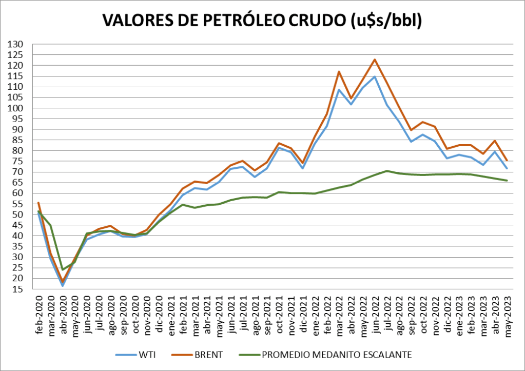 El promedio nacional de mayo 2023 es de 65,99 dólares por barril, un dólar por barril menos que el mes anterior.