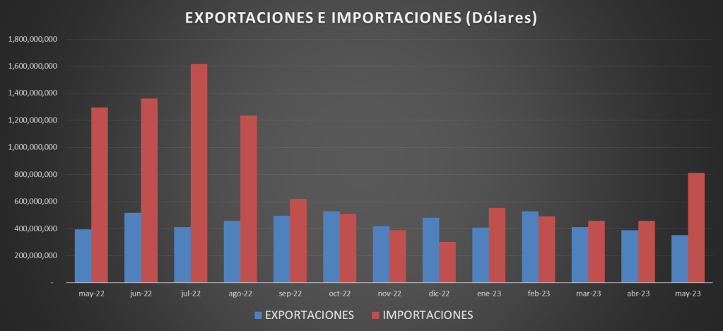 Las importaciones totales en mayo de 2023 fueron de 811,9 MMu$s y las exportaciones de 350,7 MMu$s, resultando un balance negativo de 461,2 MMu$s.
