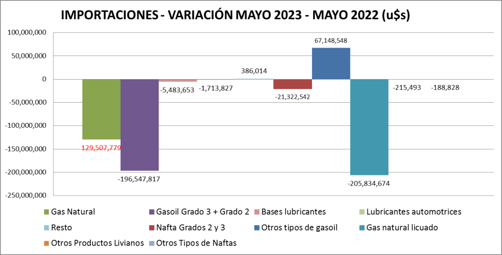 Para el mes de mayo de 2023, al no registrar, la Secretaría de Energía, nuevamente, importaciones de gasoil para generación ni de fuel oil, hemos decidido incluir los datos del INDEC donde figuran valores de 144,0 millones de dólares para el primero y de 53,0 para el segundo.