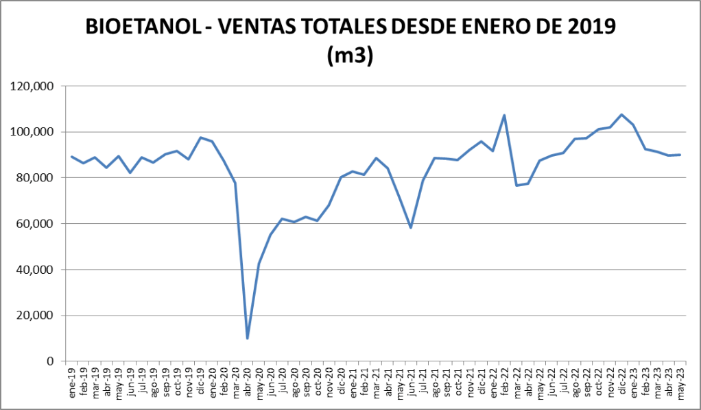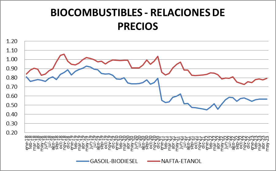 El etanol (probablemente por el aporte de octanos al blend de naftas) mantuvo su nivel. El contenido de bioetanol en naftas fue del 10,76% en mayo de 2023, casi igual a abril, y respetando el promedio histórico.