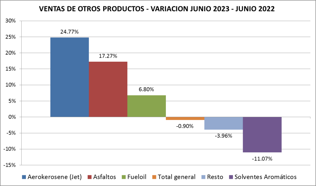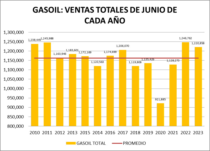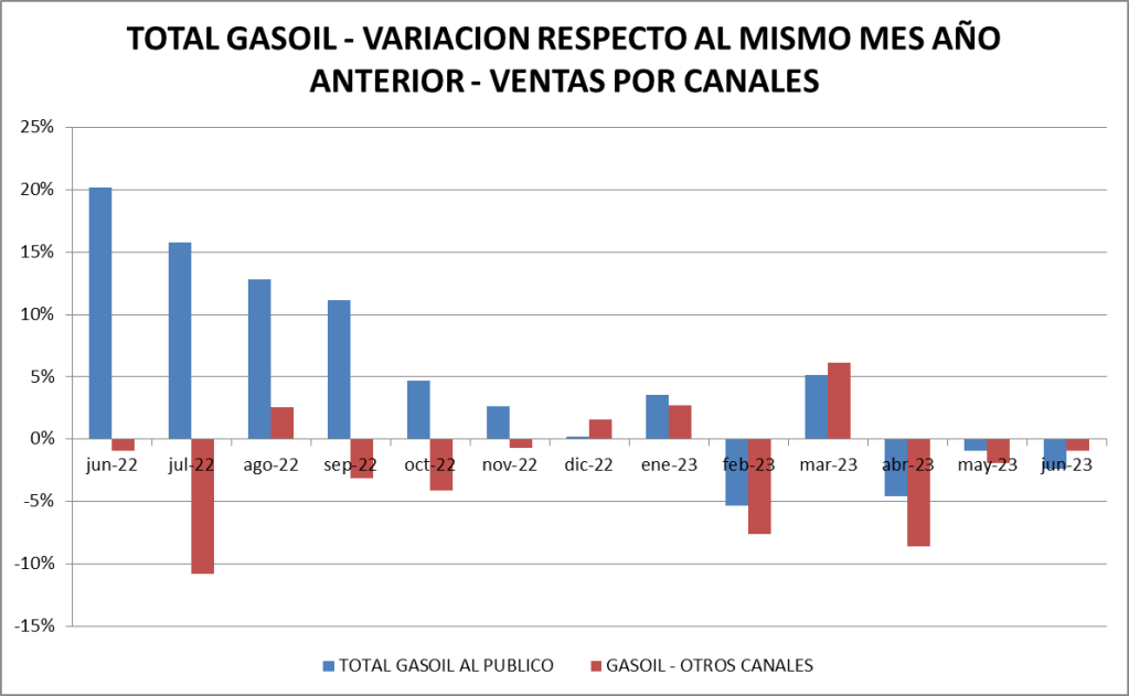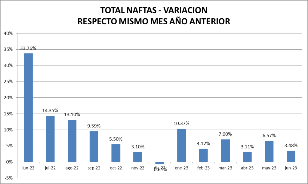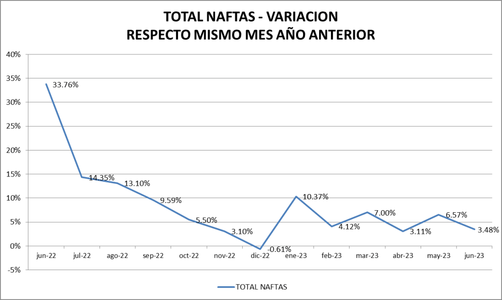 En junio de 2023, las ventas totales de naftas cayeron un 1,82 % respecto al mes anterior mientras que las de gasoil también tuvieron un descenso, pero del 3,38%. Estos valores deben siempre ser interpretados teniendo en consideración que junio tiene 30 días y mayo 31. Si se corrigen calculando la venta promedio diaria las naftas totales subieron un 1,45% y descenso del gasoil fue de sólo el 0,16%.