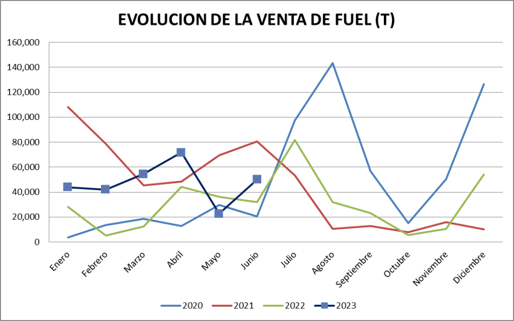 Las ventas de fuel oil registradas en abril son 50.038 toneladas, cifra superior a lo vendido en el año 2022 (31.979 t).