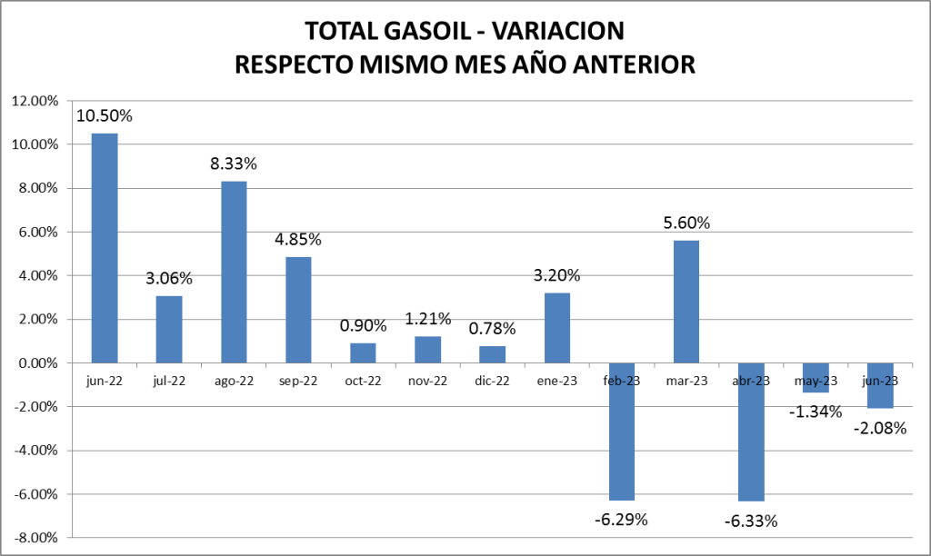 El gasoil total vende, en junio de 2023, un 2,08% menos que en el 2022.