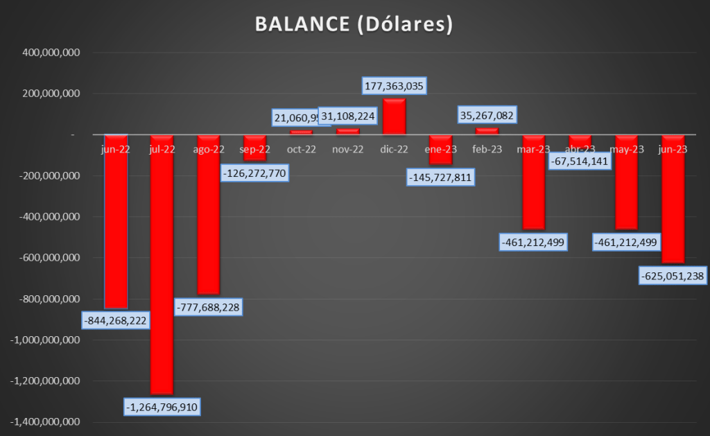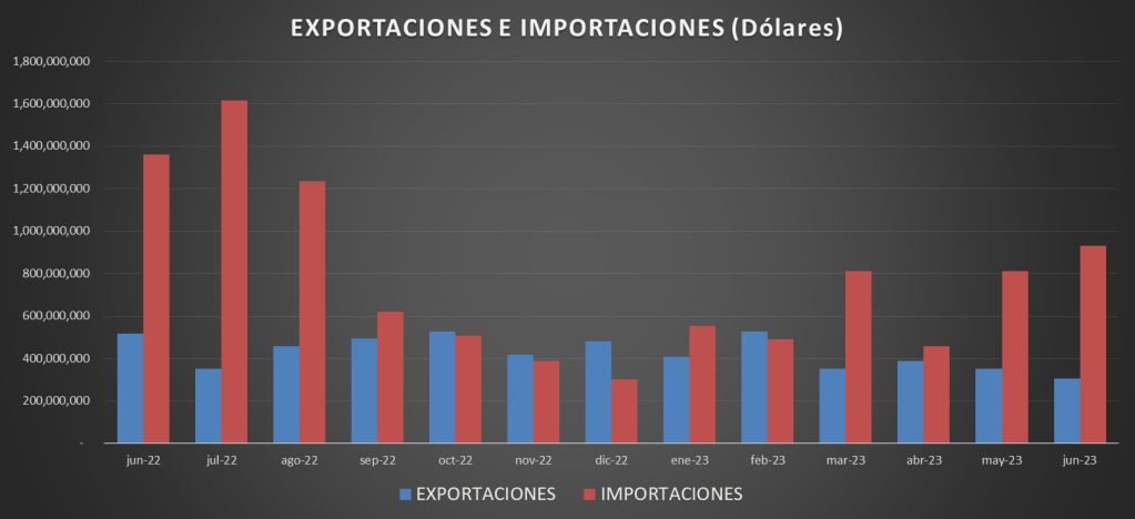 Las importaciones totales en junio de 2023 fueron de 931,2 MMu$s y las exportaciones de 306,2 MMu$s, resultando un balance negativo de 625,7 MMu$s.