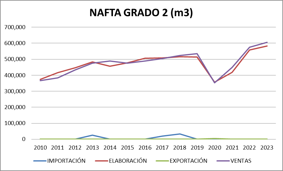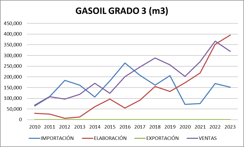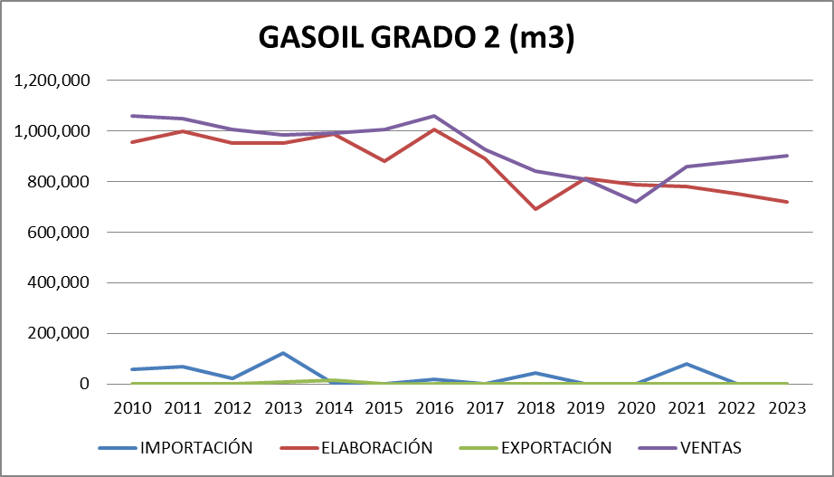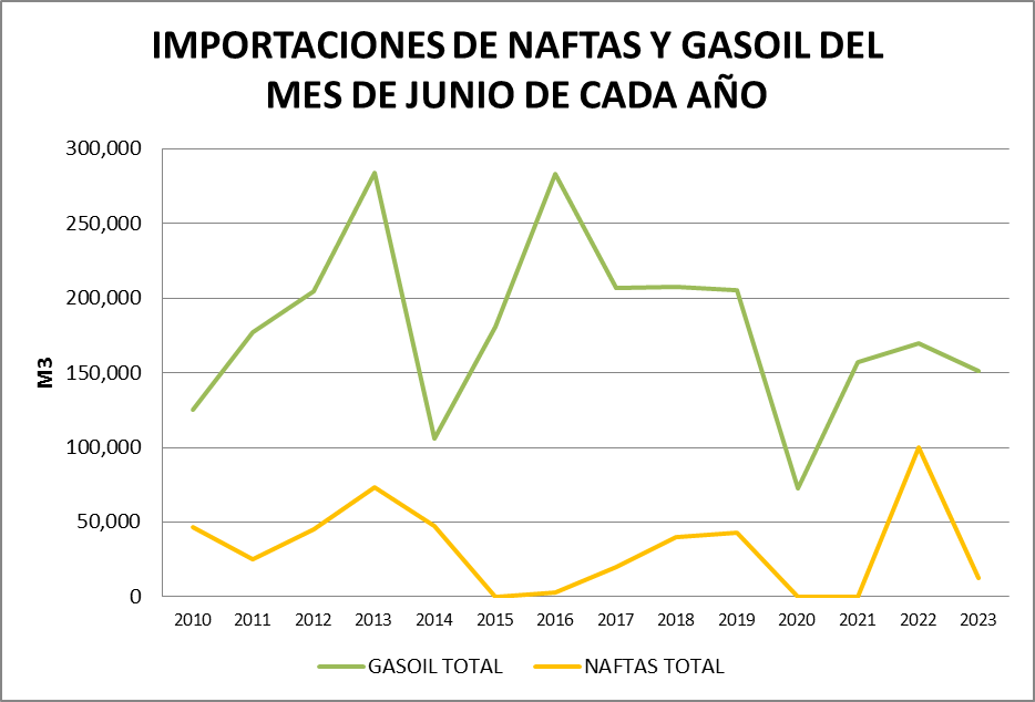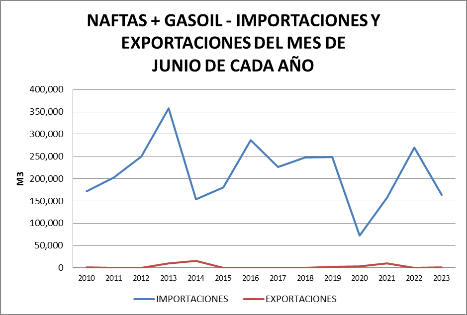La importación de los cuatro productos representó en junio de 2023 cerca del 8,02% del total vendido y se importó gasoil grado 3 y nafta grado 3. El 47,45% del gasoil grado 3 vendido provino de la importación mientras que el 5,80% de esta nafta vendida en el mercado interno fue importada.