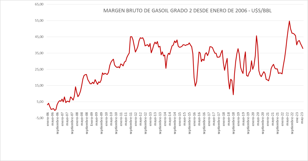 El Margen del gasoil grado 2 de junio de 2023 (37,88 u$s/bbl) se sitúa por encima del promedio del período enero de 2016 a junio de 2023 (30,64 u$s/bbl).