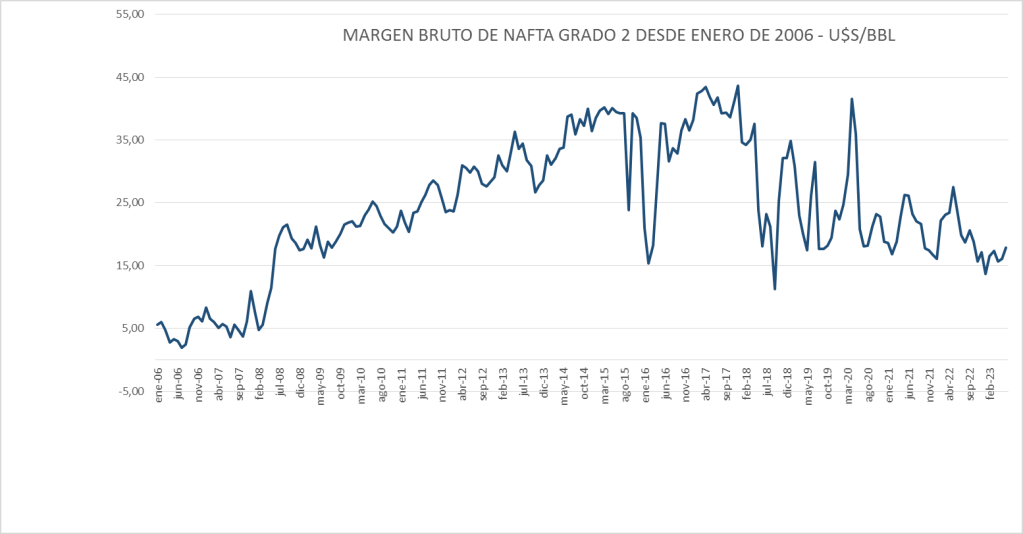 El margen bruto de nafta sigue por debajo del valor del promedio del período enero 2020 – mayo 2023.