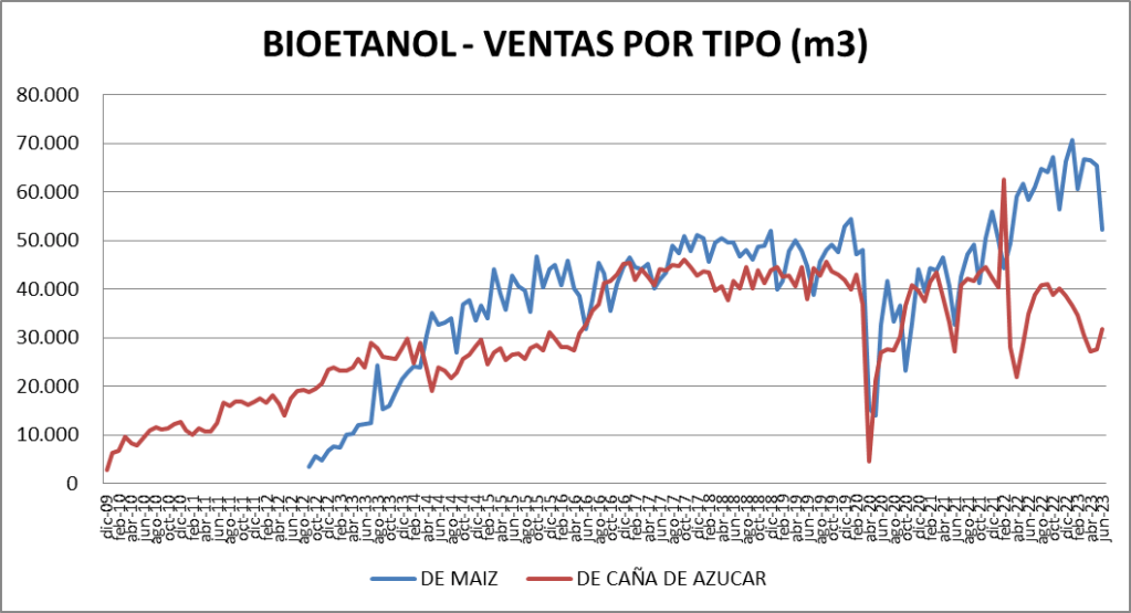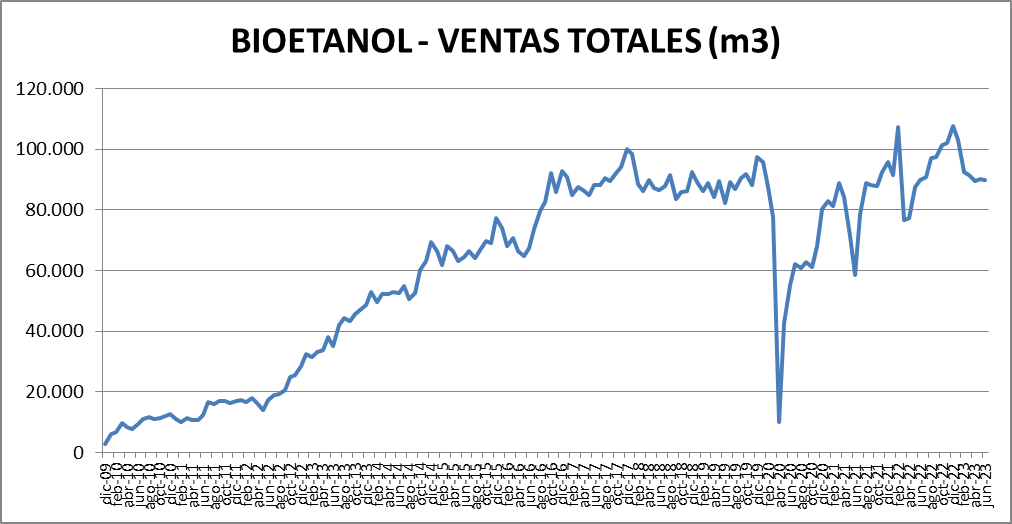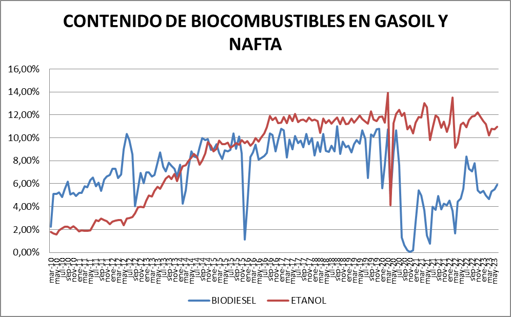 El etanol (probablemente por el aporte de octanos al blend de naftas) mantuvo su nivel. El contenido de bioetanol en naftas fue del 10,95% en junio de 2023, algo superior a mayo, y respetando el promedio histórico.
