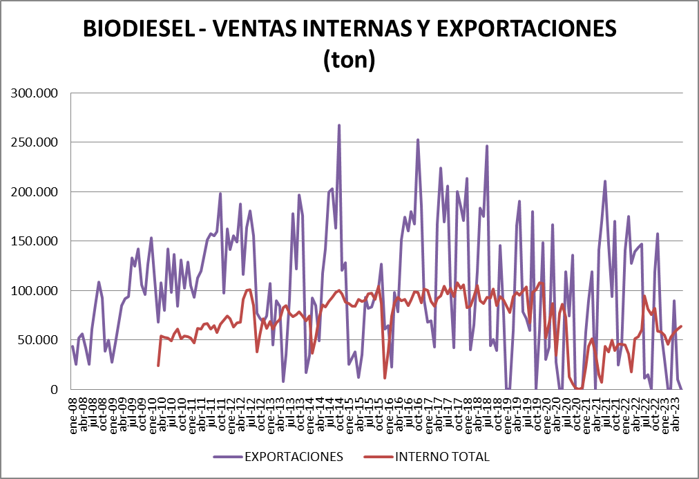 Para el biodiesel, la información parte desde enero de 2008 para las exportaciones y desde febrero de 2010 para la venta a refinerías.