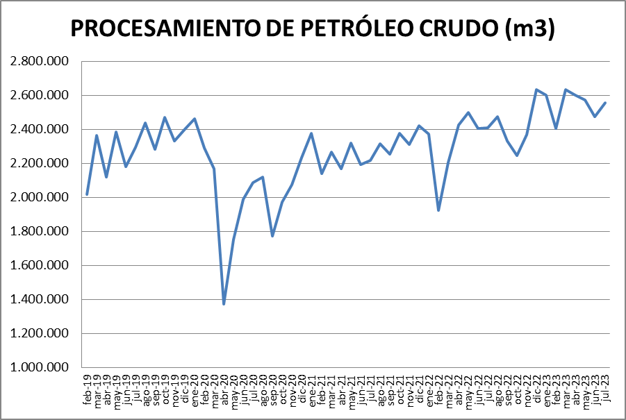 En julio de 2023, el procesamiento de petróleo crudo subió un 3,35% respecto del mes anterior.