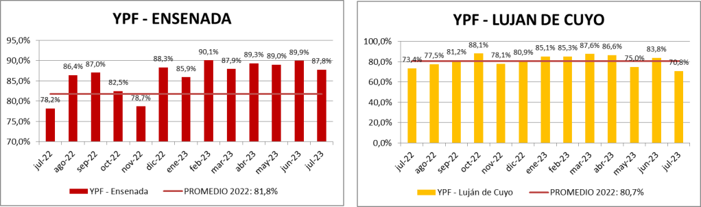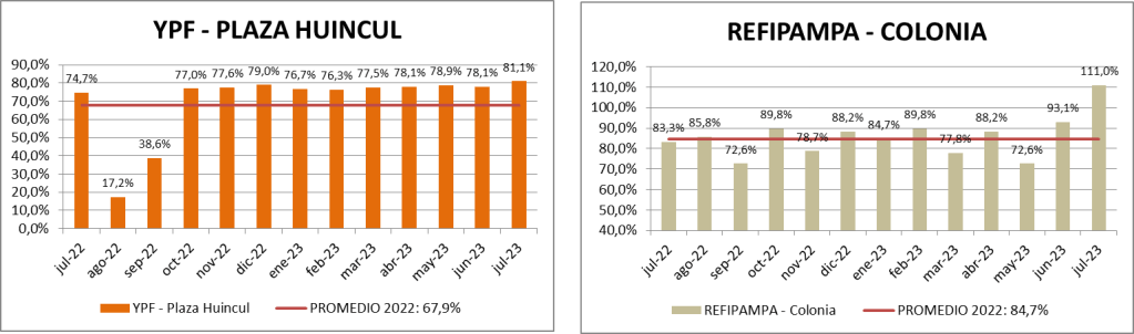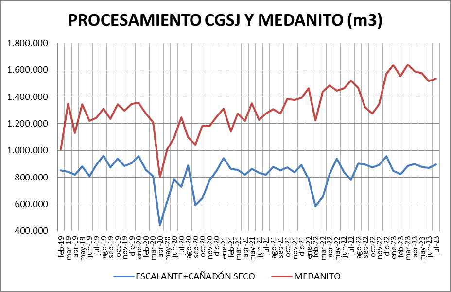 Escalante-Cañadón Seco: Se procesó, en julio de 2023, un 2,96% más que en junio de 2023 y un 14,86% más que en julio de 2022. Si se calcula el procesamiento diario, teniendo en cuenta que junio tiene 30 días y julio 31, el procesamiento fue un 0,4% menor que el mes anterior.
