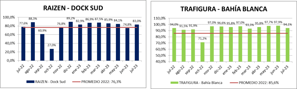 Con respecto a julio del año 2022 se cargó 24,69% menos. Recordar que en el año 2022 arreciaba el desabastecimiento de gasoil y se hizo uso de la capacidad ociosa de producción de biodiesel.