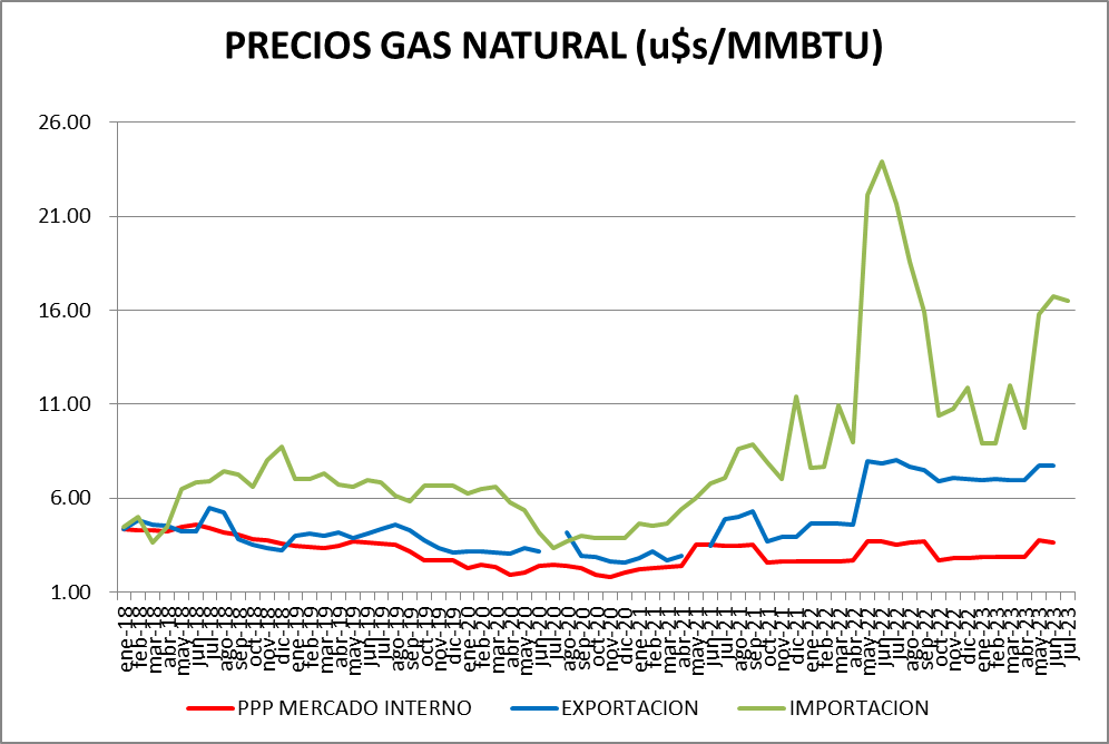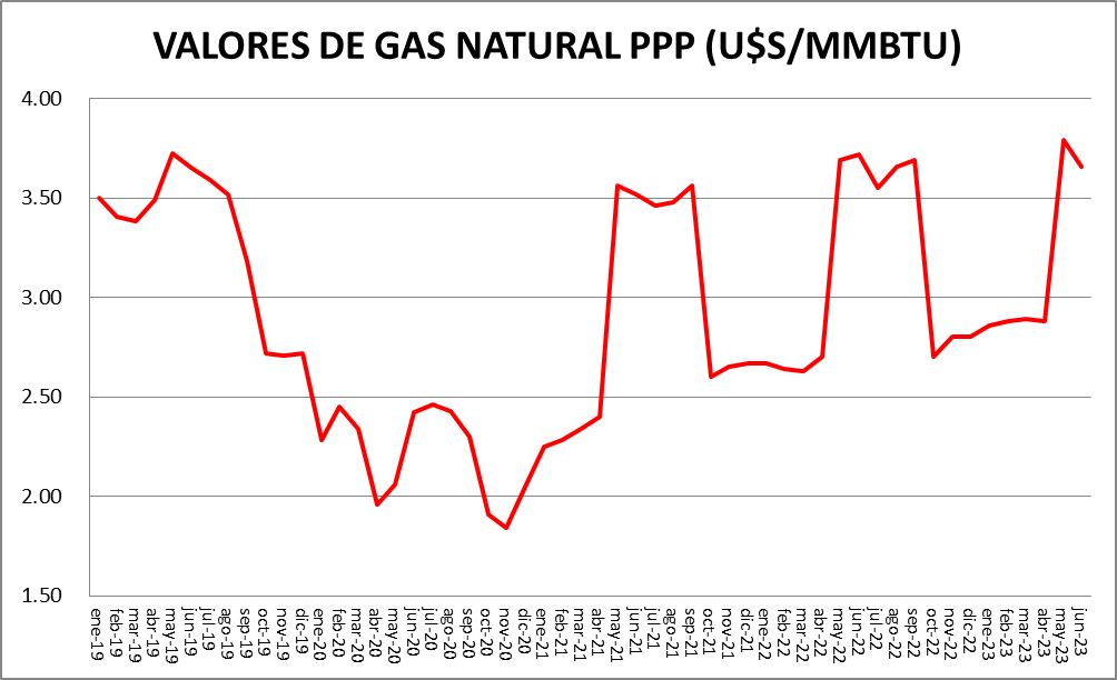 En junio de 2023 se producen modificaciones menores de los precios promedio a nivel general. El valor de 3,66 dólares por millón de BTU es un 1,61% menor que el de junio de 2022.
