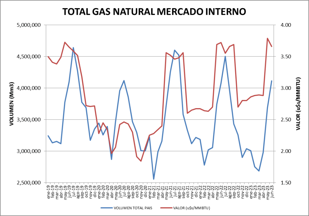 El volumen total comercializado en el mercado interno (137,17 MMm3/día) resulta, en juniol de 2023, un 8,56% inferior al mismo mes del año anterior y un 11,65% mayor que mayo de 2023.