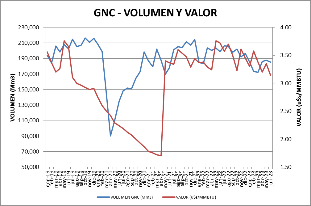 Se vendieron, en abril de 2023, 6,17 MMm3/día de Gas Natural Comprimido, valor un 1,36% por debajo del mes anterior y un 10,32% menor al de junio de 2022.