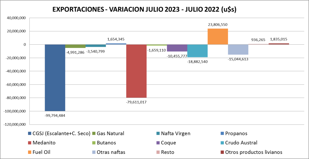 En julio de 2023 se exportaron 158.376 m3 de crudo desde la Cuenca del Golfo San Jorge (Escalante y Cañadón Seco).