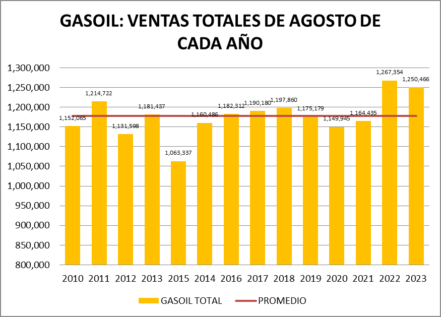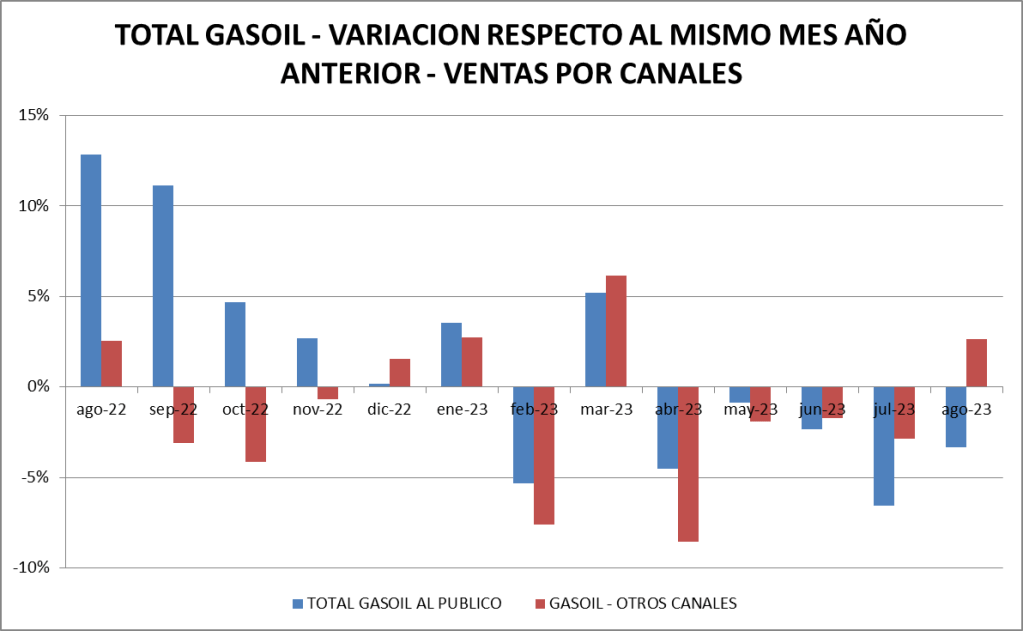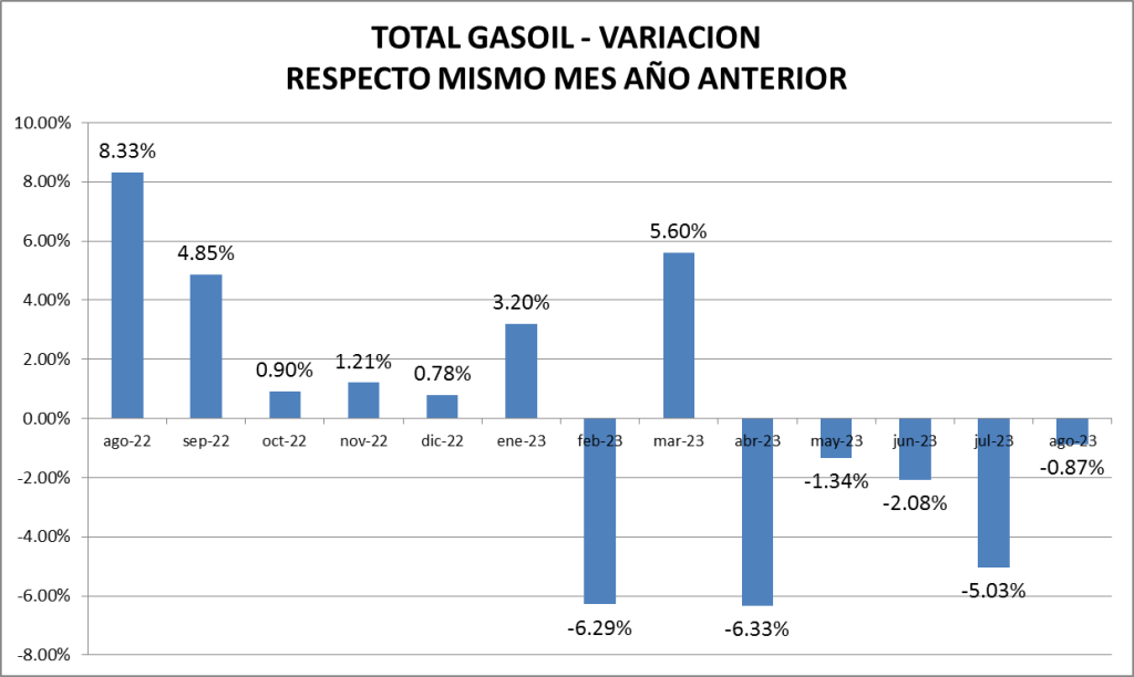 En el gráfico que mostramos a continuación puede verse que la venta de gasoil total en agosto de 2023 es menor que la del año anterior.