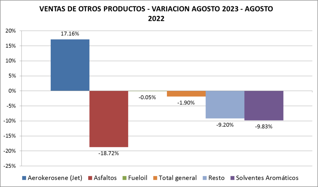 En agosto de 2023, las ventas totales de naftas bajaron un 0,41 % respecto al mes anterior mientras que las de gasoil tuvieron un ascenso del 2,89%.