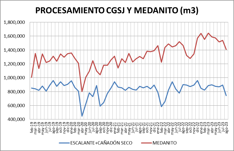 Escalante-Cañadón Seco: Se procesó, en agosto de 2023, un 17,12% menos que en julio de 2023 y un 17,81% también menos que en agosto de 2022.