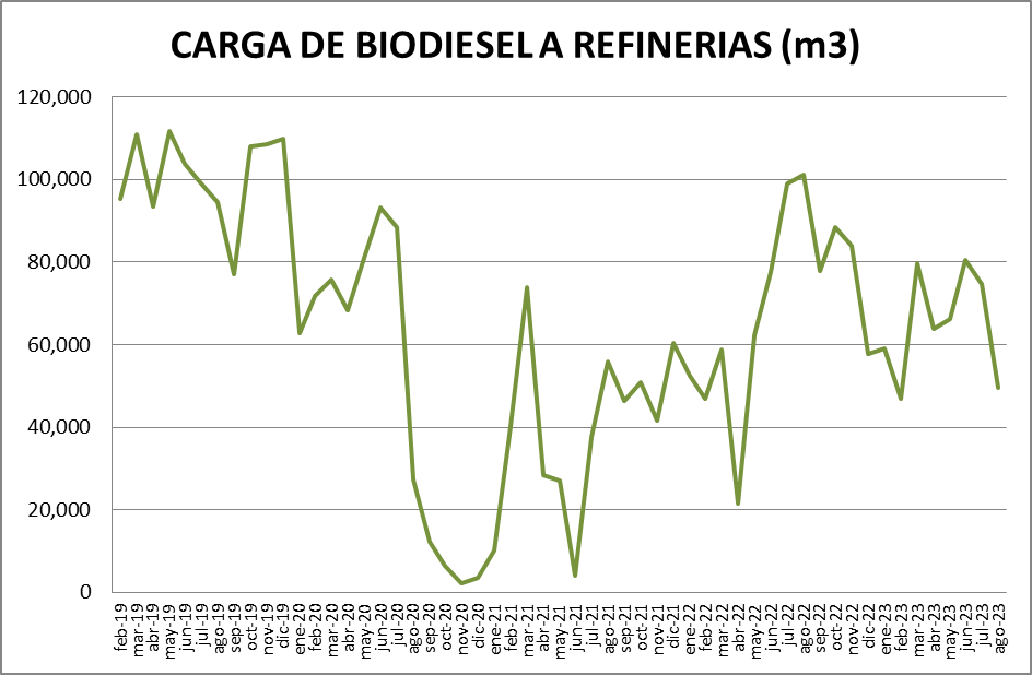 La carga de biodiesel en refinerías bajó, en agosto de 2023, un 33,82% respecto al mes anterior.