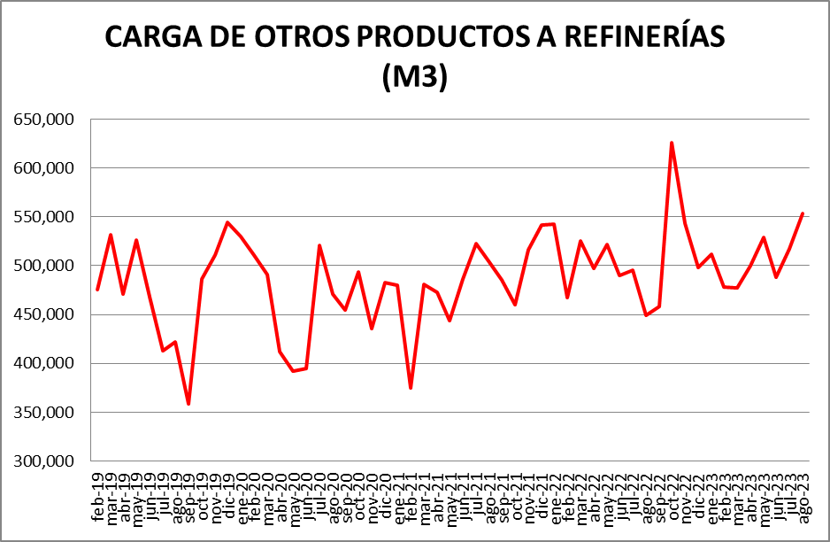 Dentro del rubro “Otras cargas” donde ” se encuentran: naftas sin terminar, mejoradores octánicos, cortes de gasoil, nafta virgen, cortes de kerosene, nafta reformada, destilado de vacío, etc., la evolución fue la siguiente: respecto a julio de 2023: +7,13%; respecto a agosto de 2022: +23,31%.