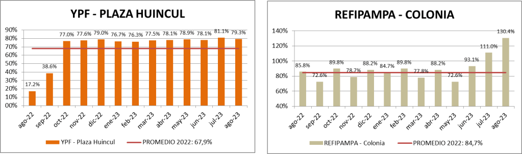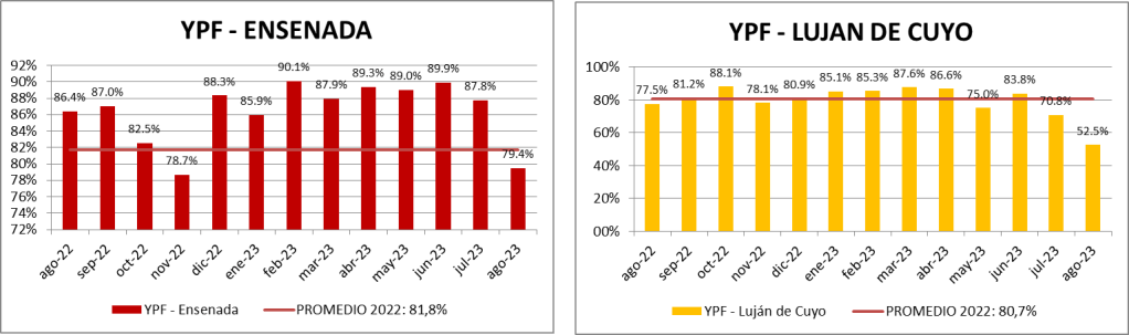 Este nuevo contenido, que lo encontrarán al final del informe, nos muestra un descenso del aprovechamiento de la capacidad instalada en las refinerías de YPF de Ensenada y Luján de Cuyo y en la refinería de AXION en Campana.