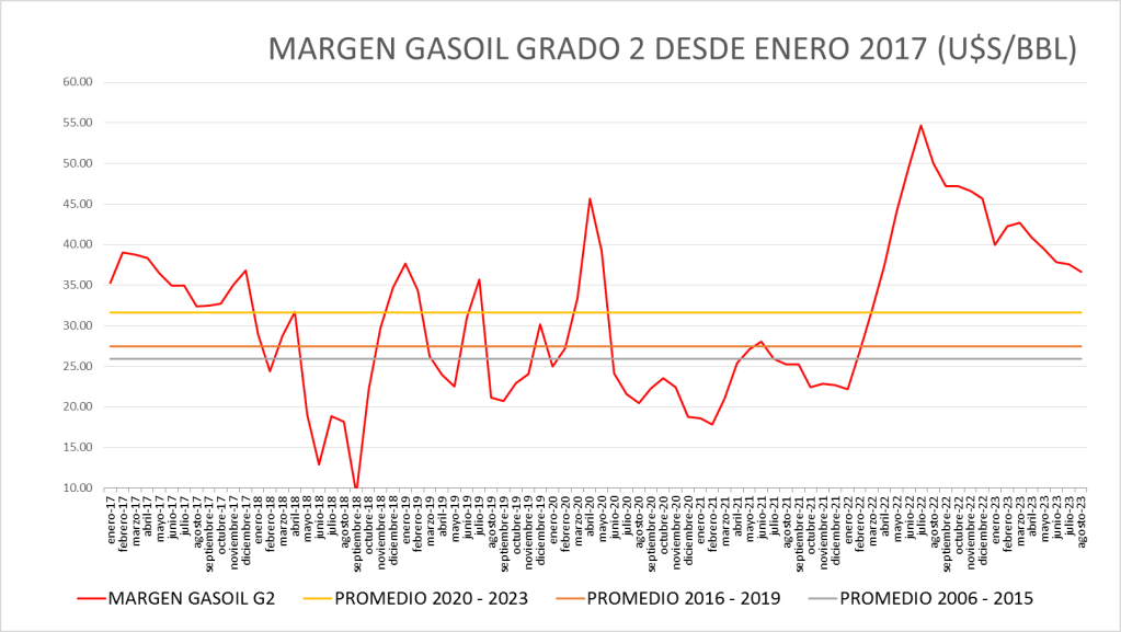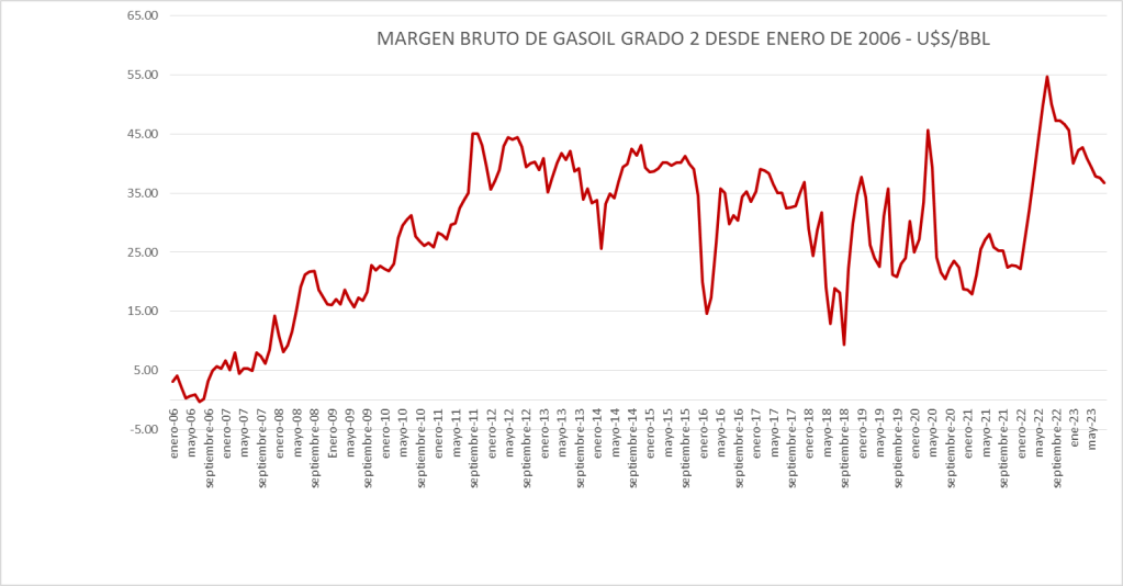 El Margen del gasoil grado 2 de junio de 2023 (36,65 u$s/bbl) se sitúa por encima del promedio del período enero de 2016 a agosto de 2023 (30,80 u$s/bbl).