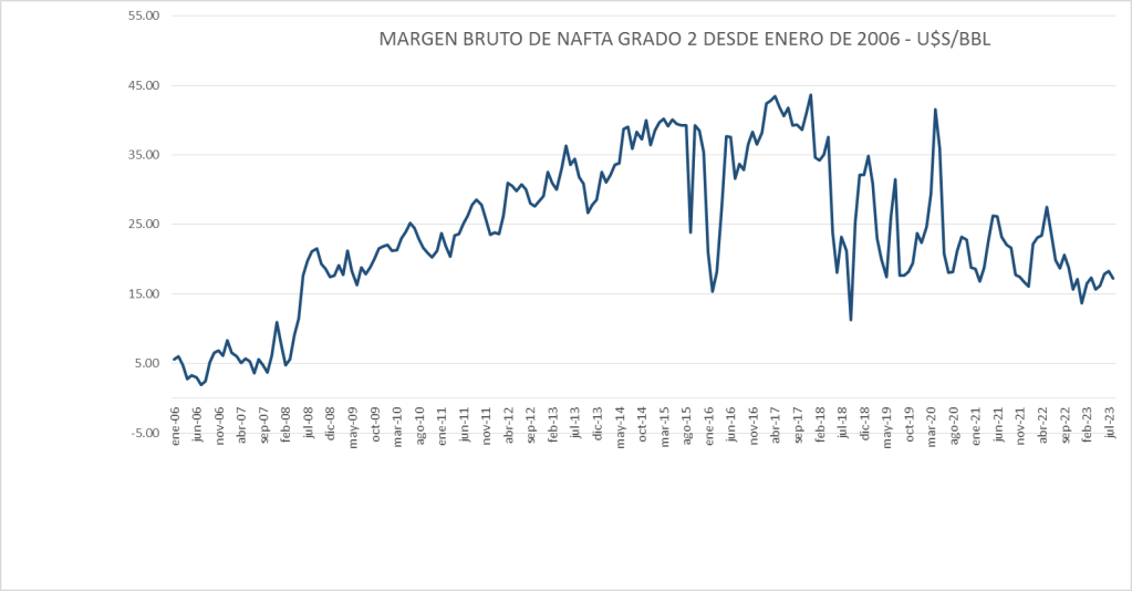 El margen bruto de nafta sigue por debajo del valor del promedio del período enero 2020 – agosto 2023.