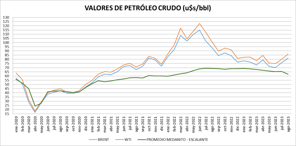 El promedio nacional de agosto 2023 es de 62,13 dólares por barril, 3,44 dólares por barril menos que el mes anterior.