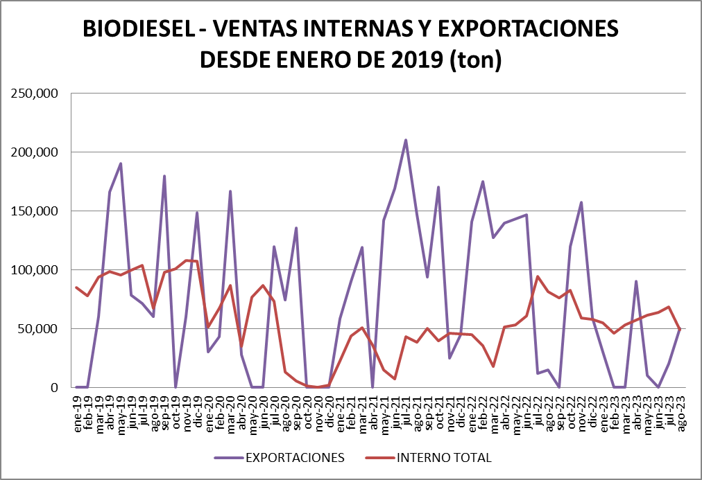 Se registran exportaciones de biodiesel en agosto de 2023 por 50.000 toneladas. El acumulado del año es, ahora, de 200.000 toneladas. El acumulado a la misma fecha de 2022 fue de más de 895.000 toneladas.