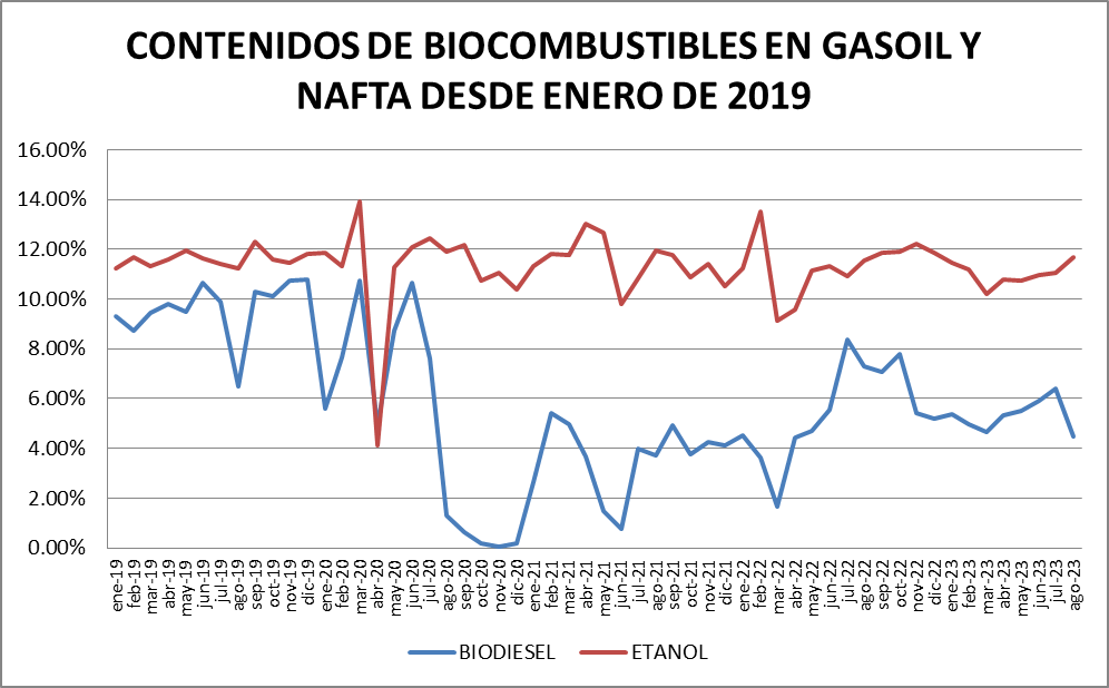 El etanol (probablemente por el aporte de octanos al blend de naftas) mantuvo su nivel. El contenido de bioetanol en naftas fue del 11,67% en agosto de 2023, superior a julio en 5,7%, y respetando el promedio histórico.