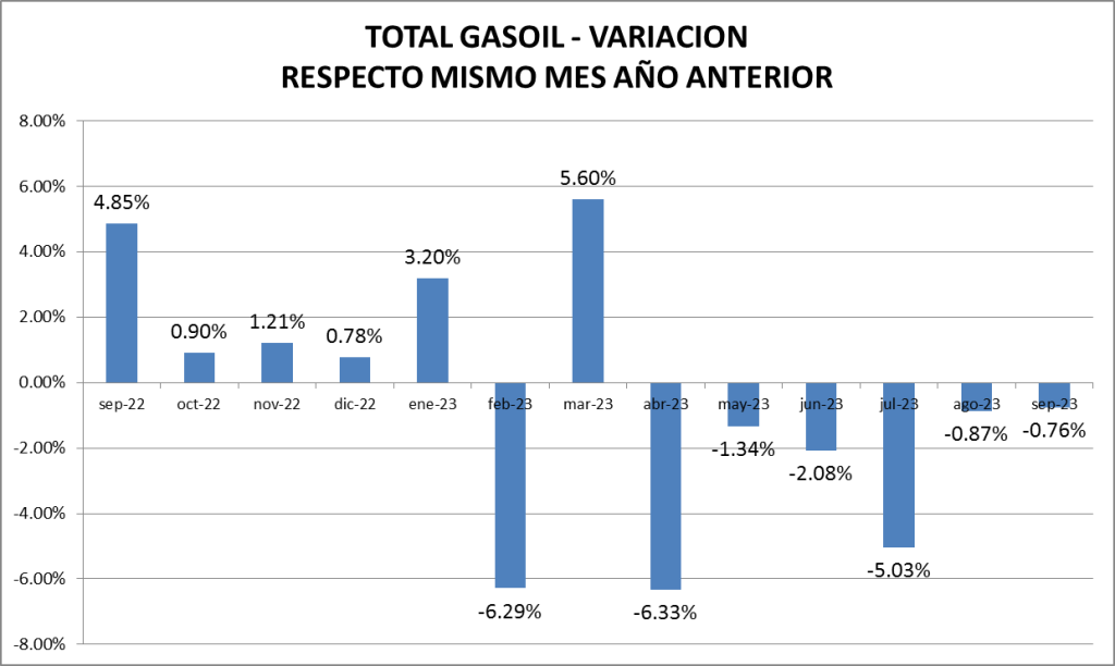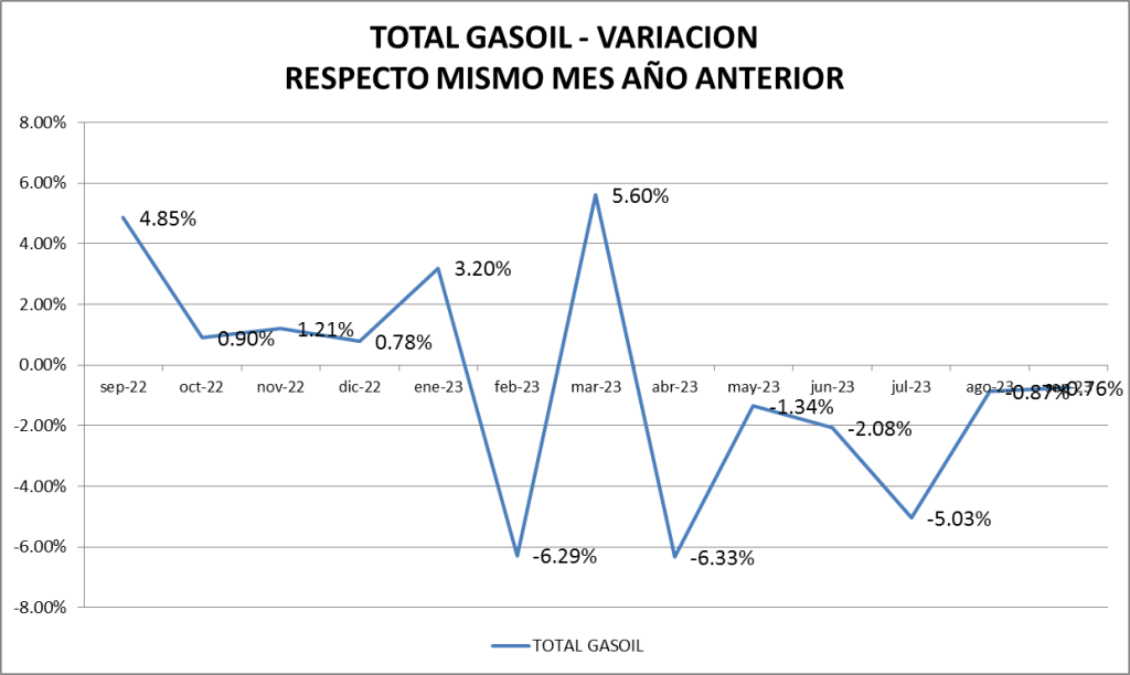En el gráfico que mostramos a continuación puede verse que la venta de gasoil total en septiembre de 2023 es menor que la del año anterior.
