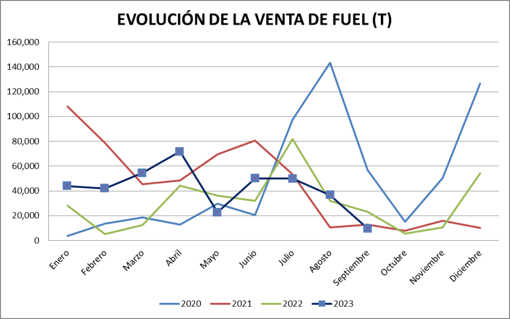 Las ventas de fuel oil registradas en septiembre son 9.775 toneladas, cifra muy por debajo de lo vendido en el año 2022 (23.339 t).