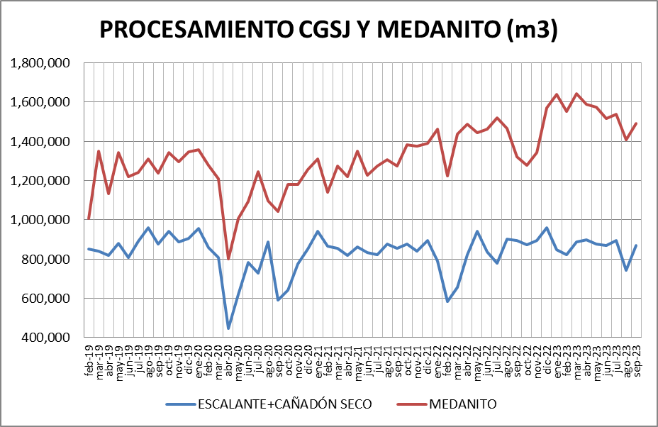 Escalante-Cañadón Seco: Se procesó, en septiembre de 2023, un 17,05% más que en agosto de 2023 y un 3,12% menos que en septiembre de 2022.