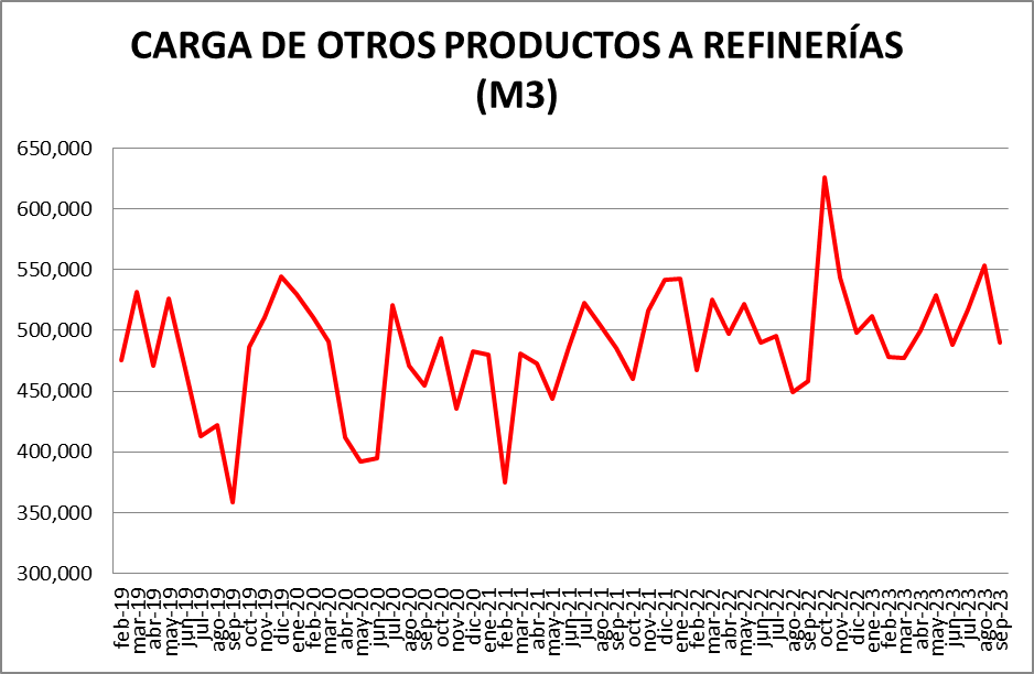 Dentro del rubro “Otras cargas” donde ” se encuentran: naftas sin terminar, mejoradores octánicos, cortes de gasoil, nafta virgen, cortes de kerosene, nafta reformada, destilado de vacío, etc., la evolución fue la siguiente: respecto a agosto de 2023: -11,57%; respecto a septiembre de 2022: +6,87%.