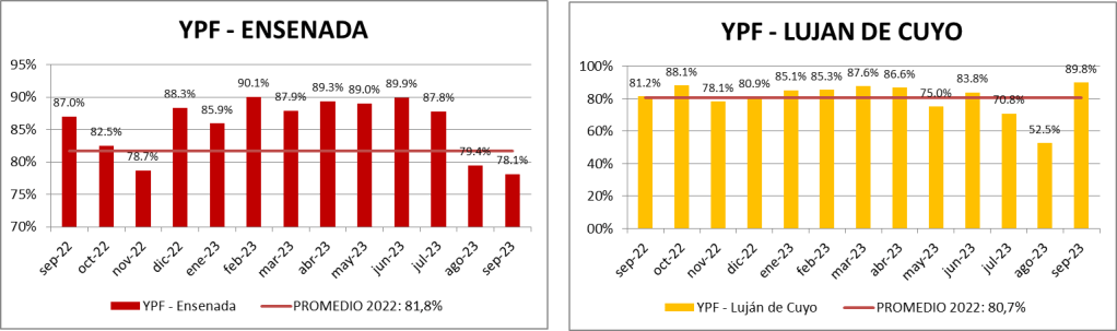 Este nuevo contenido, que lo encontrarán al final del informe, nos muestra un descenso del aprovechamiento de la capacidad instalada en las refinerías de YPF de Ensenada.
