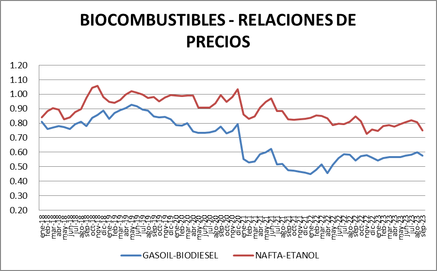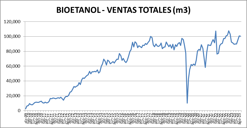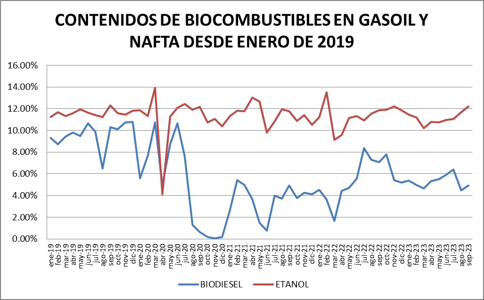 El etanol (probablemente por el aporte de octanos al blend de naftas) mantuvo su nivel. El contenido de bioetanol en naftas fue del 12,22% en septiembre de 2023, superior a agosto en 4,7%, y respetando el promedio histórico.