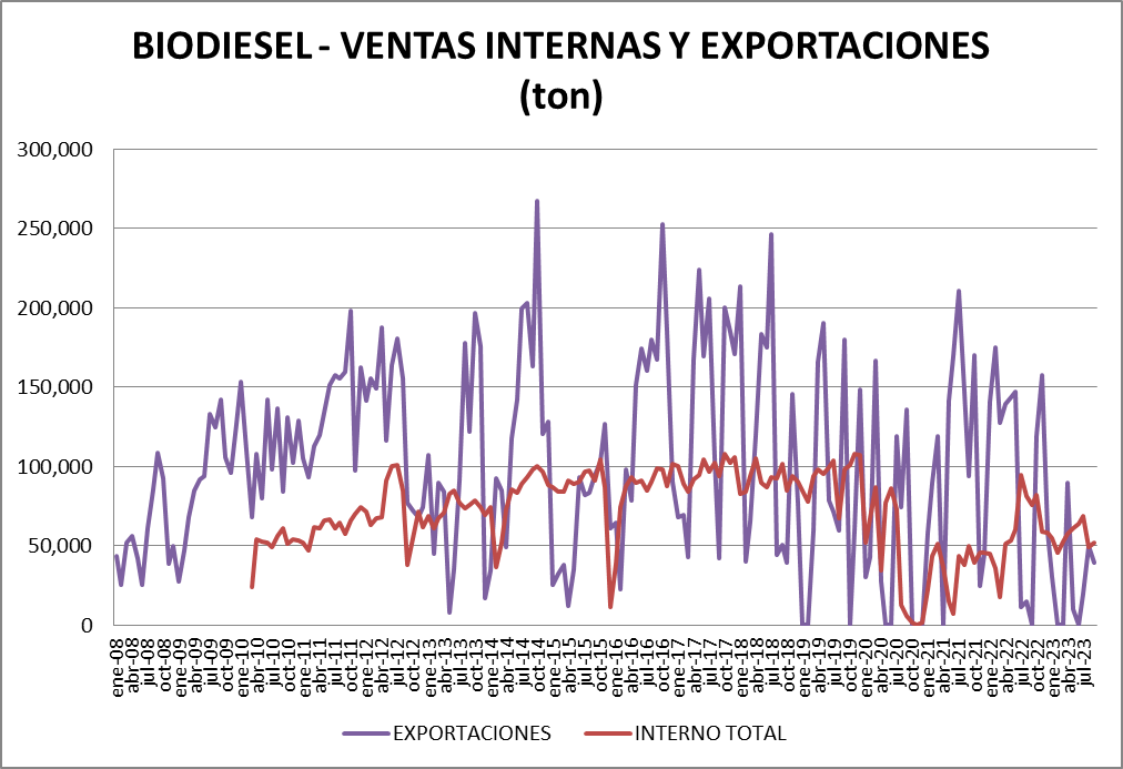 Para el biodiesel, la información parte desde enero de 2008 para las exportaciones y desde febrero de 2010 para la venta a refinerías.